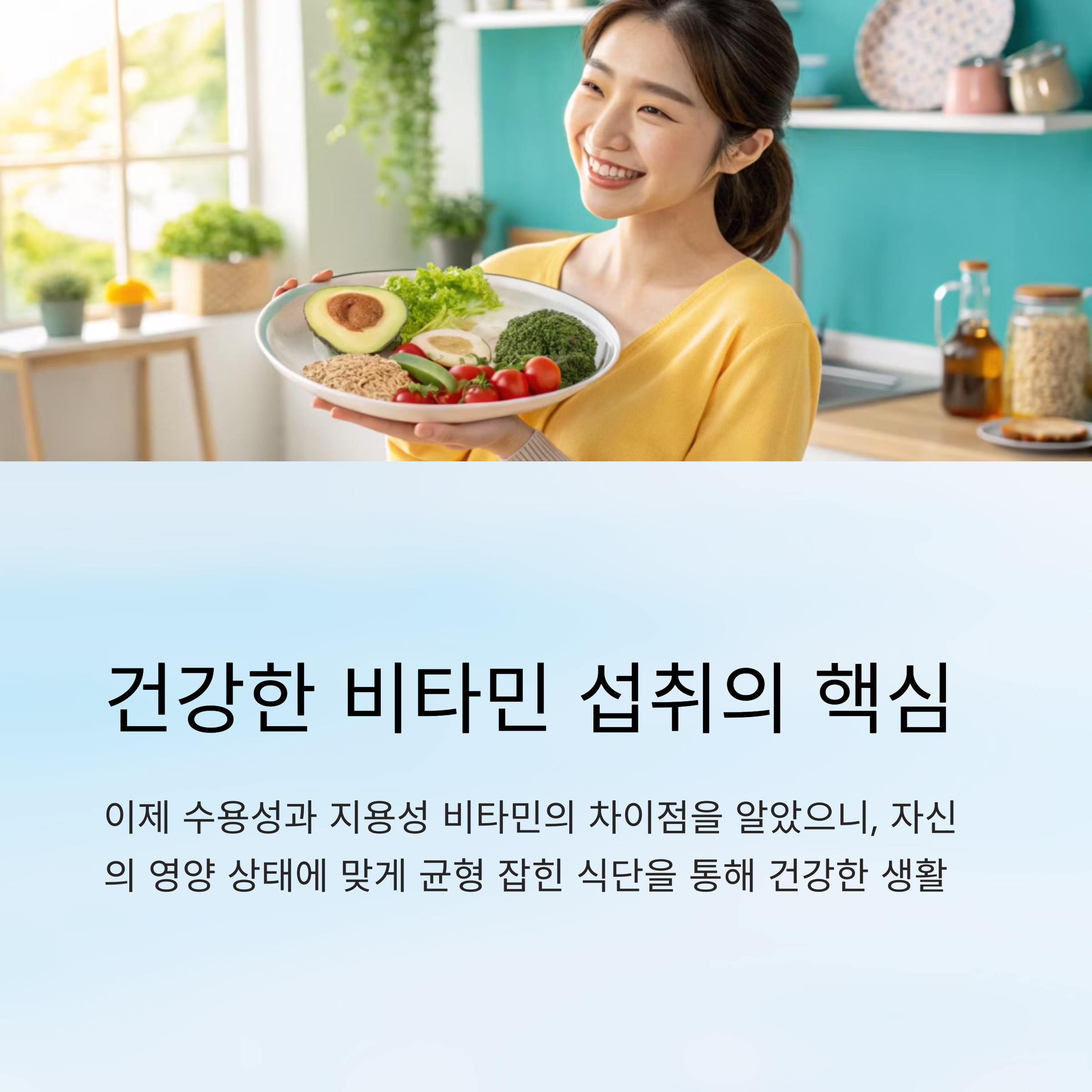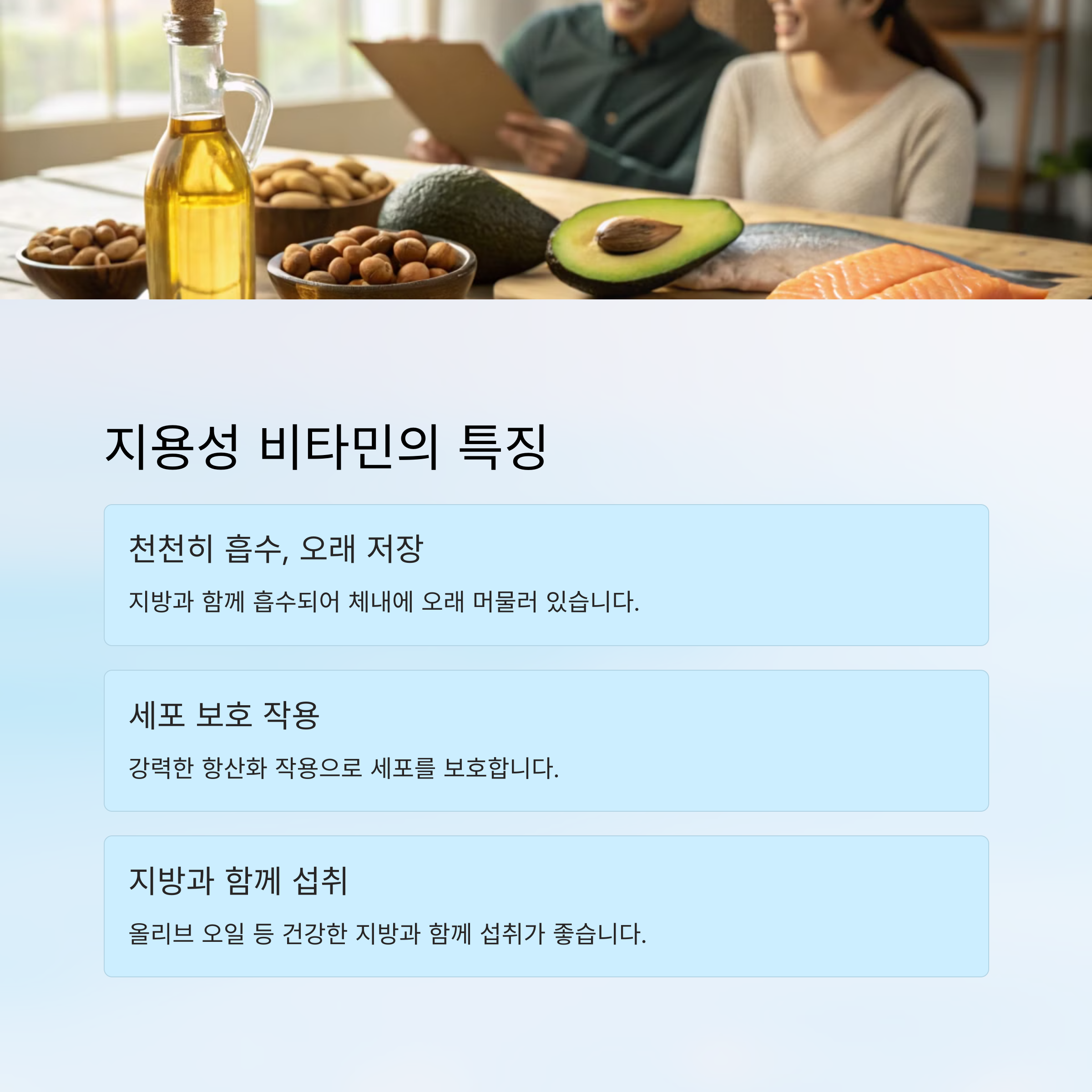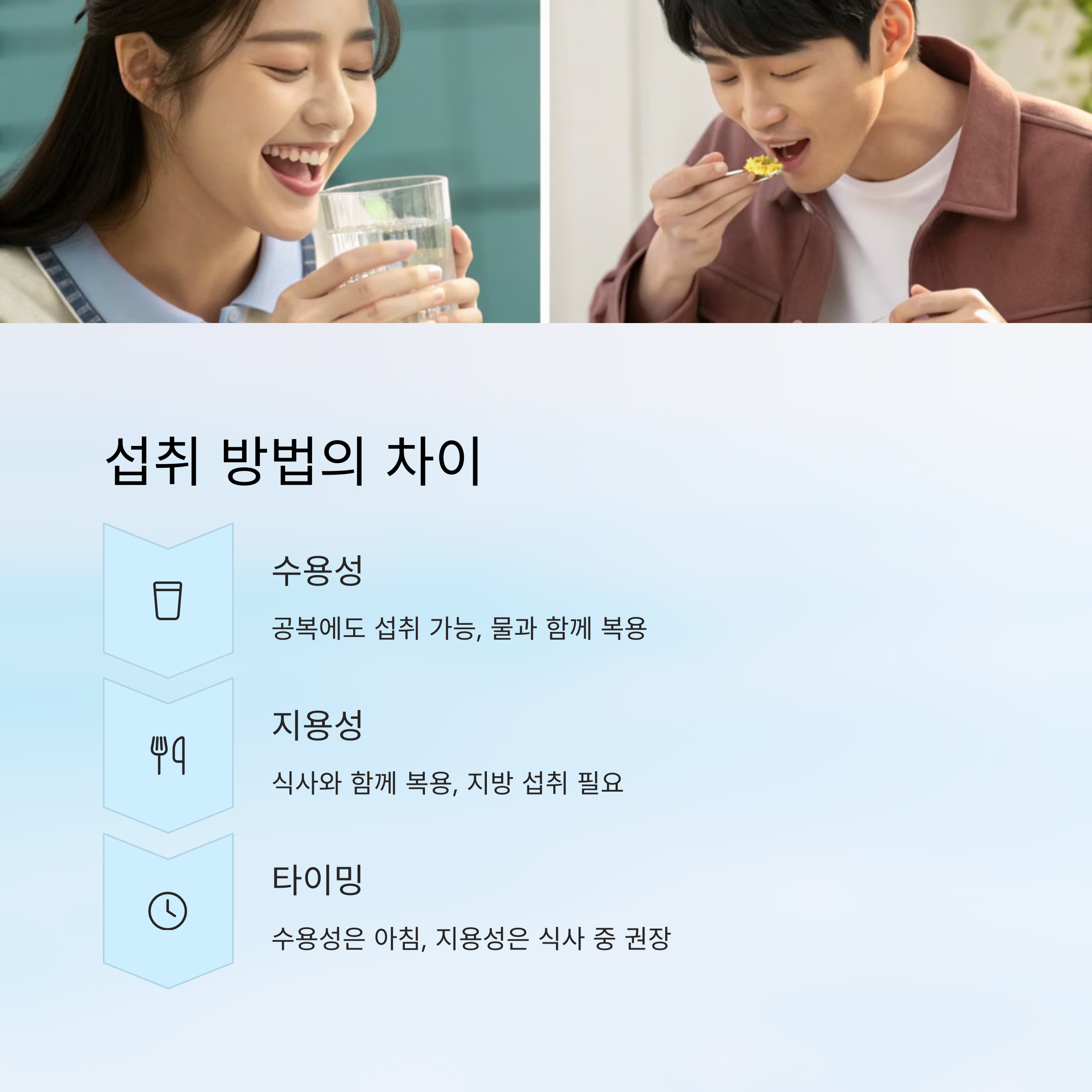 | 비타민 C, B군 | 비타민 A, D, E, K | 식사와 함께 섭취 시 흡수율 ↑ |