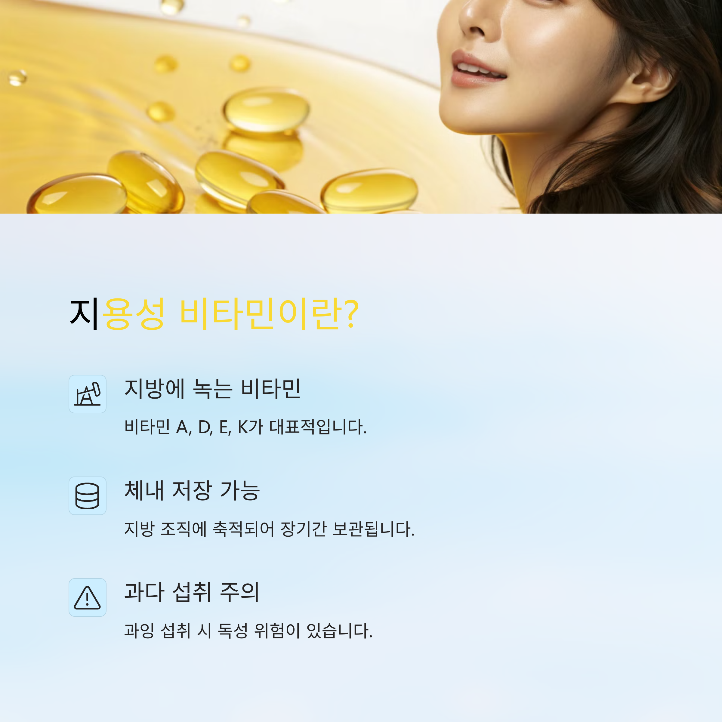 | 지용성 비타민 | 지방에 녹는 비타민. 체내에 저장 가능하며 과잉 섭취 시 부작용 우려. 대표적으로 A, D, E, K |